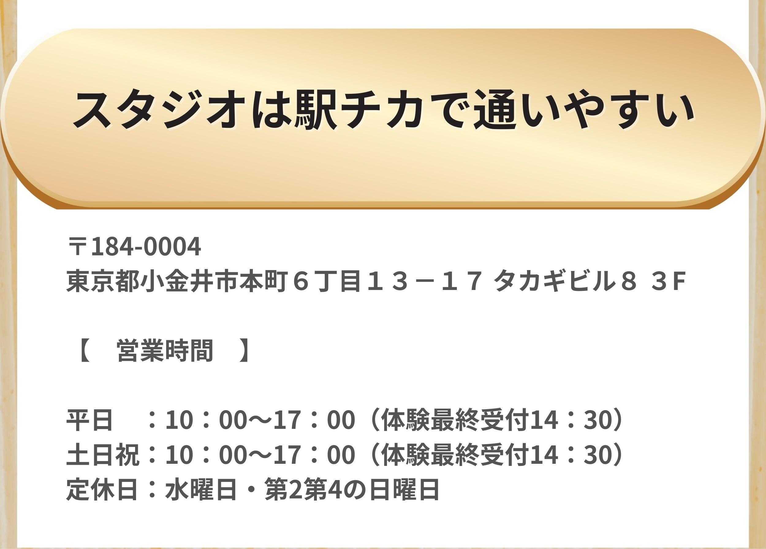 平日:10:00 ~ 17:00(体験最終受付14:30)